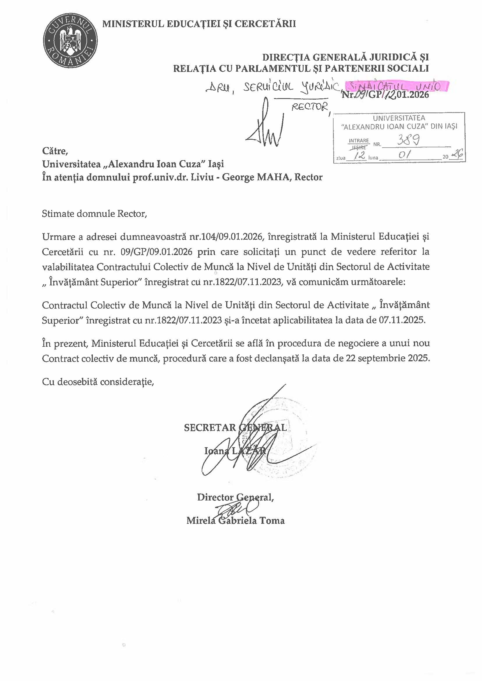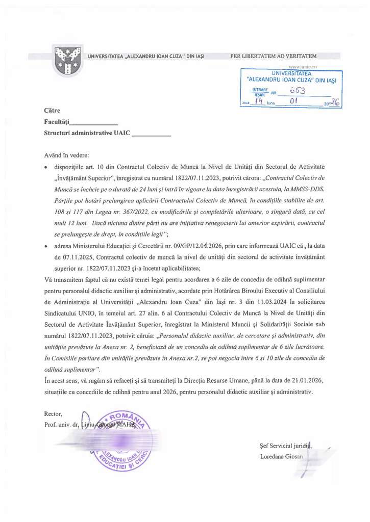 Conducerea Universității „Alexandru Ioan Cuza” din Iași a emis Adresa Nr. 653/14.01.2026 prin care solicită reprogramarea concediilor angajaților, fără cele 6 zile suplimentare câștigate prin negociere și prevăzute în Contractul Colectiv de Muncă la Nivel de Unități din Sectorul de Activitate „Învățământ Superior”, care a expirat la data de 7 noiembrie 2025.