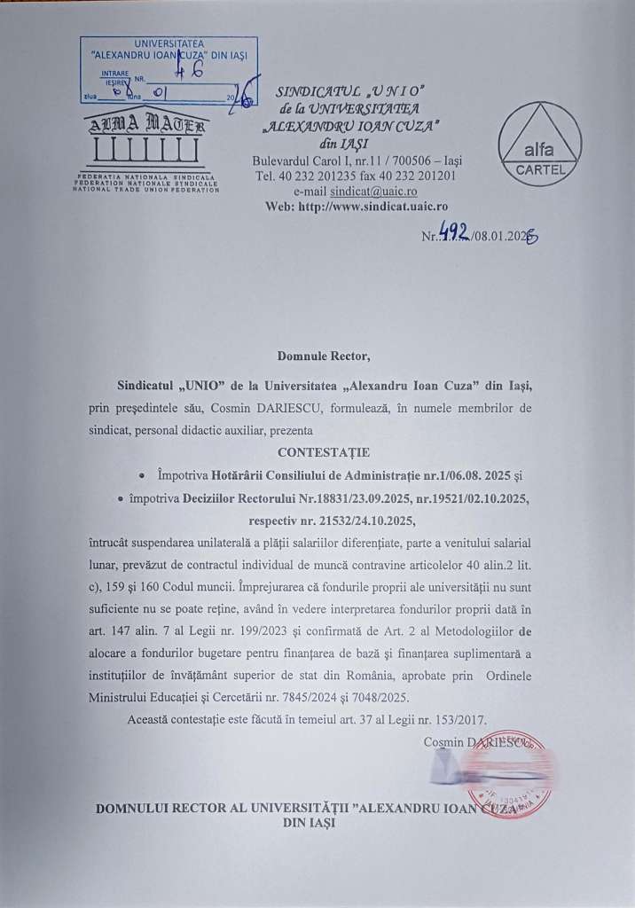 Sindicatul UNIO a formulat în numele membrilor de sindicat, personal didactic-auxiliar, o contestație împotriva Hotărârii Consiliului de Administrație Nr. 1/06.08.2025 șiîmpotriva Deciziilor Rectorului Nr. 18831/23.09.2025, Nr. 19521/02.10.2025 și Nr. 21532/24.10.2025.