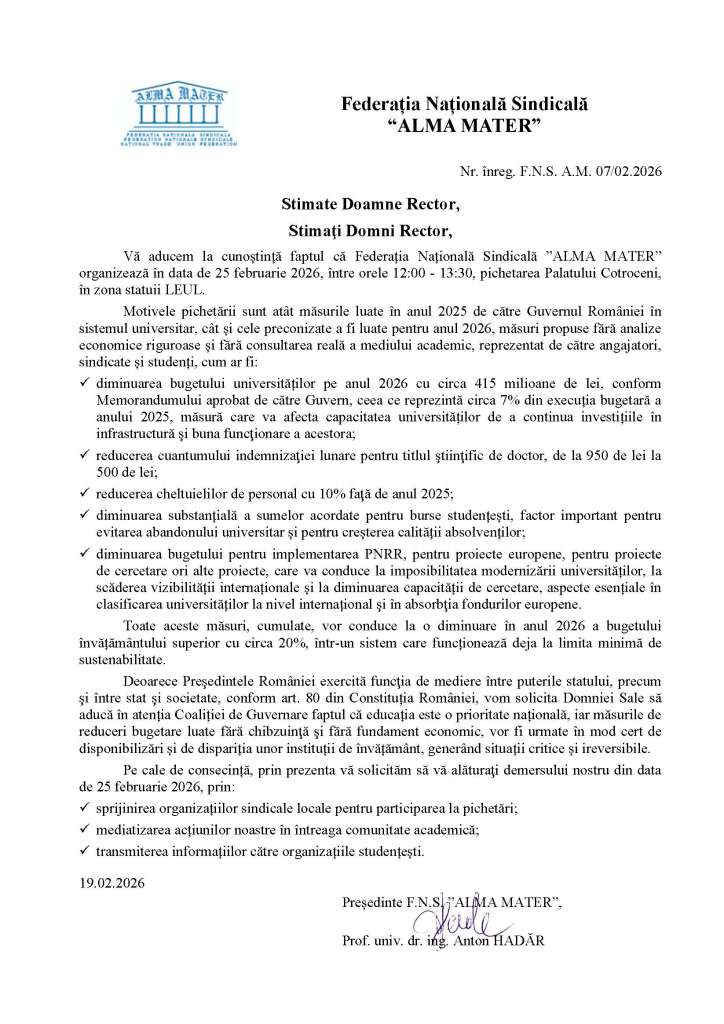 Federația Națională Sindicală „Alma Mater” a trimis către Consiliul Național al Rectorilor un document prin care solicită sprijinul pentru participarea la pichetarea din data de 25 februarie a.c., care va avea loc la Palatul Cotroceni.